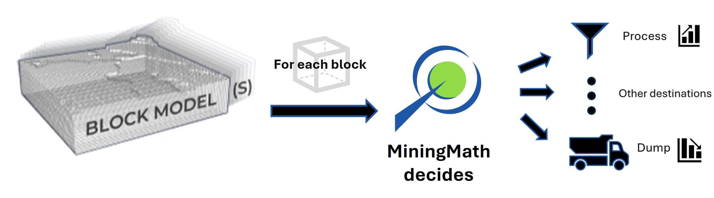 MiningMath resuelve la optimización de destinos a través de un enfoque global, enfoque de optimización de un solo paso que integra decisiones de destino con la programación a largo plazo. En lugar de analizar cada bloque o período de forma aislada, evalúa todos los destinos posibles, como el procesamiento, reservas, o desperdicio, a lo largo de toda la vida de la mina. Considera las restricciones operativas, capacidades de procesamiento, y objetivos financieros simultáneamente para maximizar el VPN. Este enfoque garantiza que las decisiones de ruta sean coherentes con la estrategia general de la mina., ofreciendo resultados más sólidos y rentables que los métodos locales o manuales tradicionales.