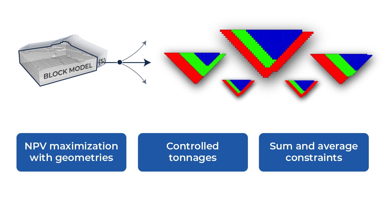 MiningMath también produce Rechazos en un solo paso que no requieren ningún conjunto predefinido de pozos anidados. Maximiza el VPN con programación matemática avanzada, controlador tonelajes, mezcla y otros requisitos. Construir fases con mayor adherencia para su planificación minera estratégica con su herramienta de programación minera preferida, o siga sus flujos de trabajo actuales. Al menos, asegúrate de tus decisiones desbloqueando una amplia gama de posibles diseños a largo plazo.
