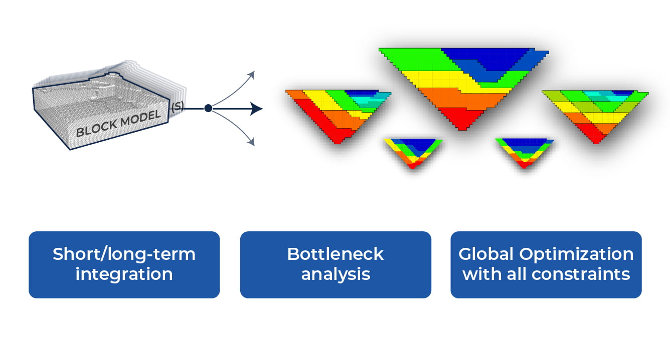 A través de modelos de Math Optimization que integran múltiples áreas del negocio, MiningMath maneja todos los parámetros simultáneamente y ofrece múltiples escenarios, teniendo en cuenta los aspectos estratégicos y tácticos.