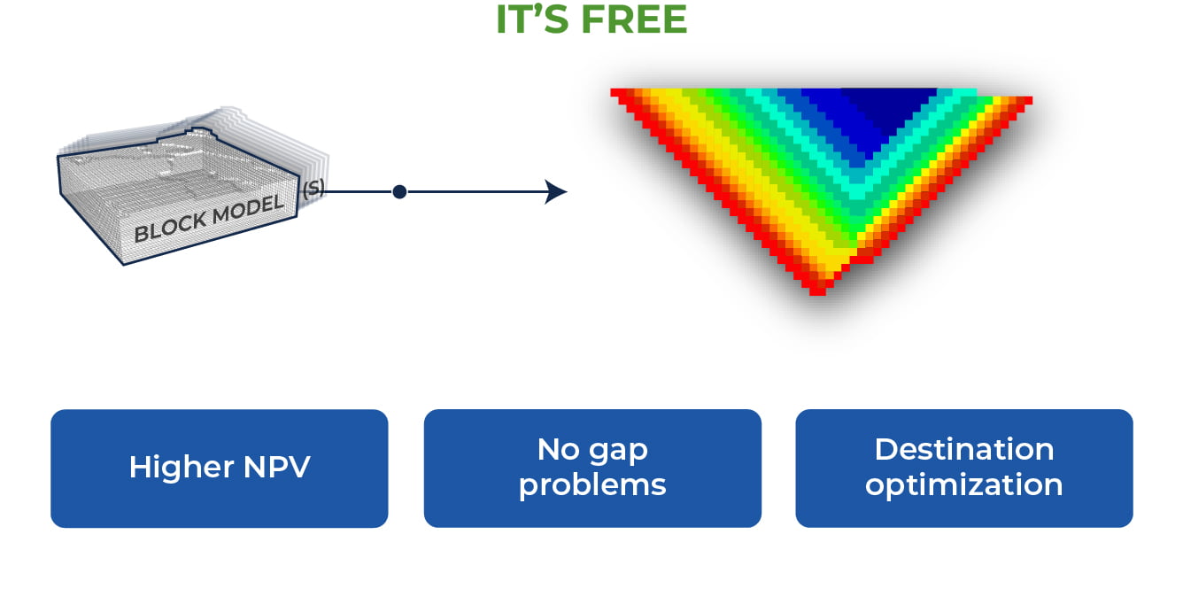 Lo algoritmo Súper mejor caso tiene el potencial de encontrar VPN más altos que los mejores escenarios basados en pozos anidados LG/Pseudoflow. Esto se debe a su algoritmo único que considera todos los períodos de minería simultáneamente, sin necesidad de factores de ingresos. MiningMath toma en cuenta las capacidades de procesamiento y la tasa de descuento, y es el único producto que considera optimización del destino de forma conjunta dentro del mismo proceso de un solo paso. Ejecute su Super Best Case gratis!