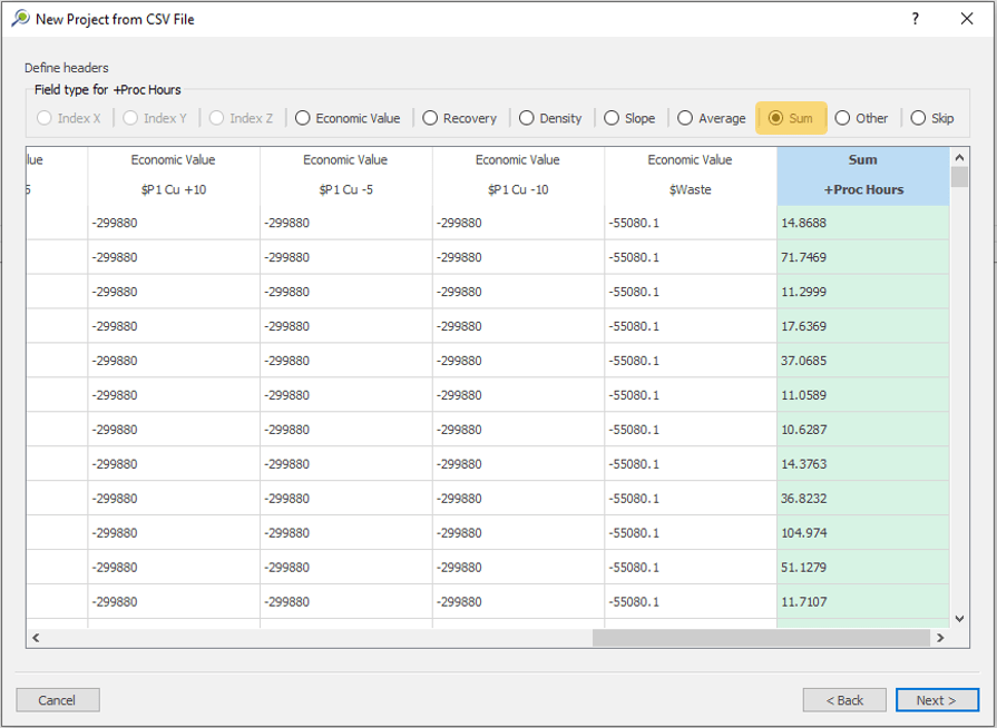 Las restricciones promedio se basan en parámetros cuantificables modelados bloque por bloque.. Para utilizar esta función, el conjunto de datos debe incluir un campo/columna auxiliar que represente el límite deseado para cada bloque.