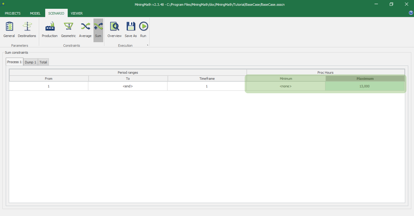 Considere el escenario anterior con un límite máximo de 13.000 horas de equipo de procesamiento. Esta restricción se puede insertar en el Suma pestaña mostrada anteriormente. El impacto de esta restricción se puede evaluar cuando los resultados se comparan con un escenario sin restricciones..