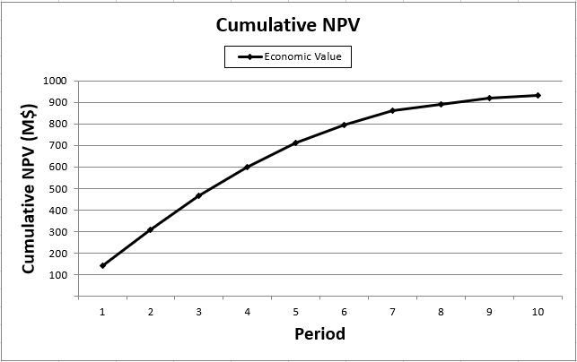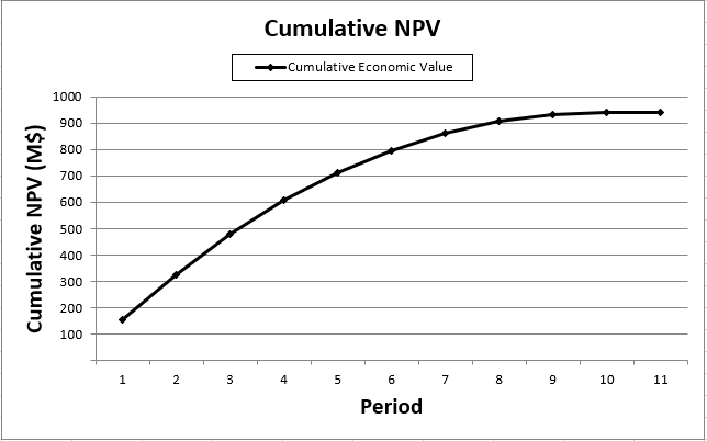 El siguiente escenario ejemplifica el impacto de una restricción Promedio en el Súper mejor caso del conjunto de datos de Marvin. En este caso, el VPN va de 942 M$ VAN en el mejor de los casos para 933 M$ en el nuevo escenario con restricciones Promedio. Por eso, la nueva restricción tiene sólo un pequeño impacto en el VAN.