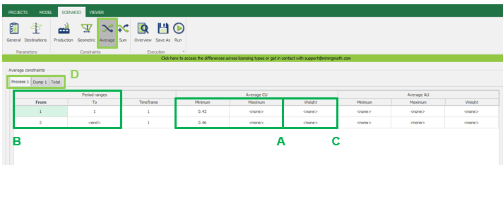 Los límites de las variables promedio se pueden definir en el Guión pestaña. Como se muestra a continuación, es posible introducir límites (A), para cada rango de periodo (B), pesas (C) y cada destino (D).