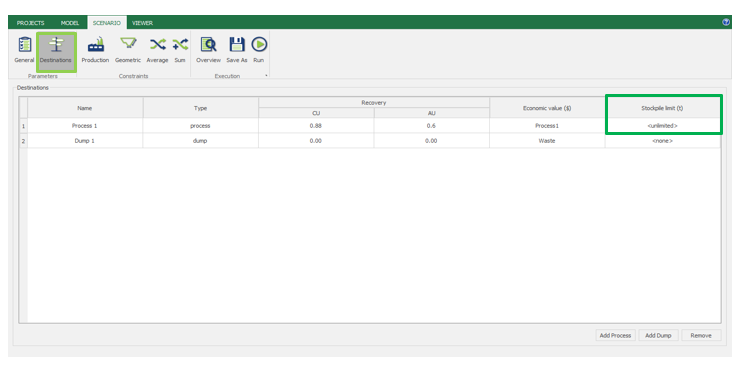 Después, sobre el Destinos pestaña, puede definir límites de existencias para cada planta de procesamiento agregada, recordando que este límite se basa sobre la vida de minmi, no en un período de tiempo.