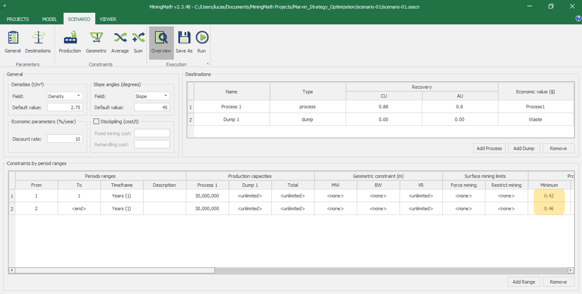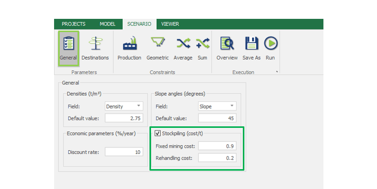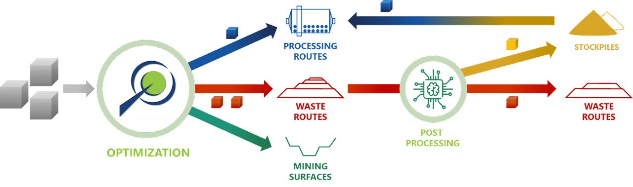Las reservas son bloques optimizados que inicialmente fueron designados para su eliminación.. Se procesan después de la fase principal de optimización., donde el algoritmo analiza su valor (Ingresos – Costo fijo de minería – Costo de remanipulación) en comparación con el costo de desecharlos. si es digno, Los bloques serán reclamados, complementar los déficits de producción a lo largo del tiempo.