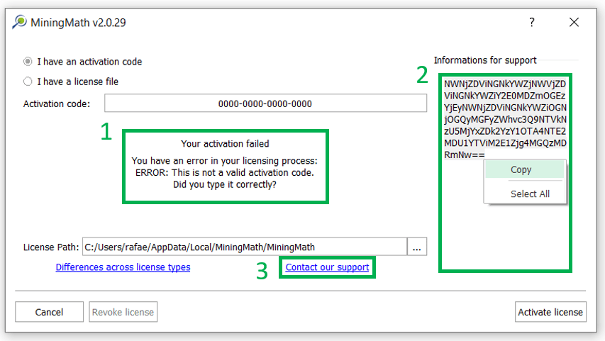 MiningMath se basa en la activación en línea basada en la conexión a Internet, o a través de un código de identificación de su hardware como una contingencia.