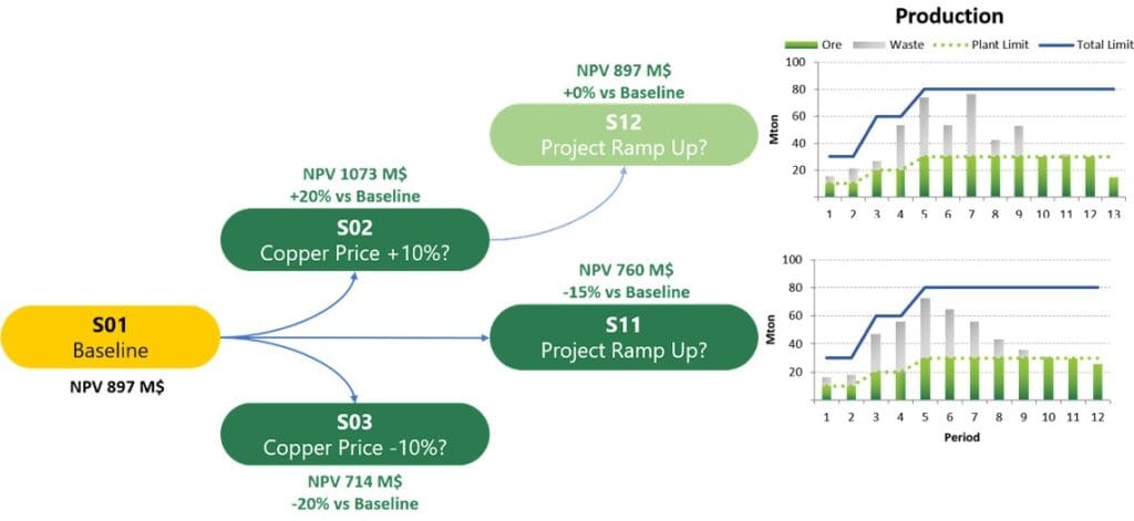 Decision Trees give you a comprehensive view of your project, helping you plan your mining sequence by evaluating every possible scenario. They allow you to assess constraints, identify the most viable and profitable options for the overall project, and understand the impact of different variables on the final NPV. For example, consider plant production per year as a variable factor. With Decision Trees, you can analyze how each constraint—such as ore price—impacts annual production and influences the overall success of the project.