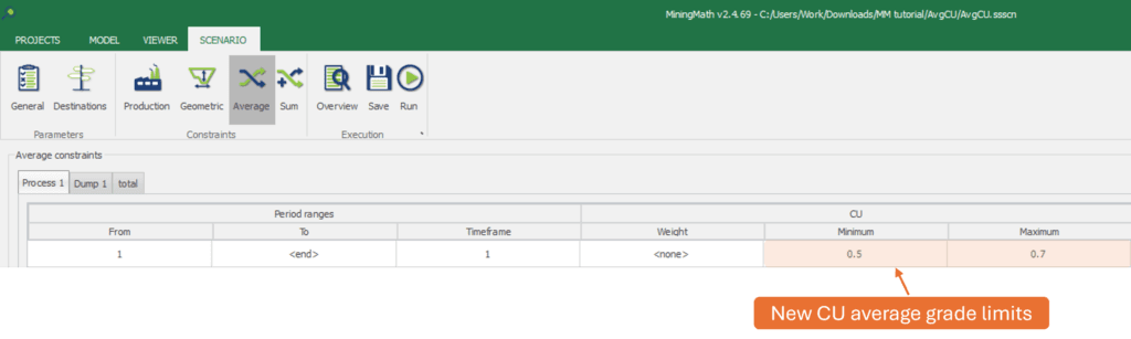 Next, let’s analyze the AvgCu scenario in which a restriction in the average grade at Process 1 was added, using a minimum and a maximum limit of copper.