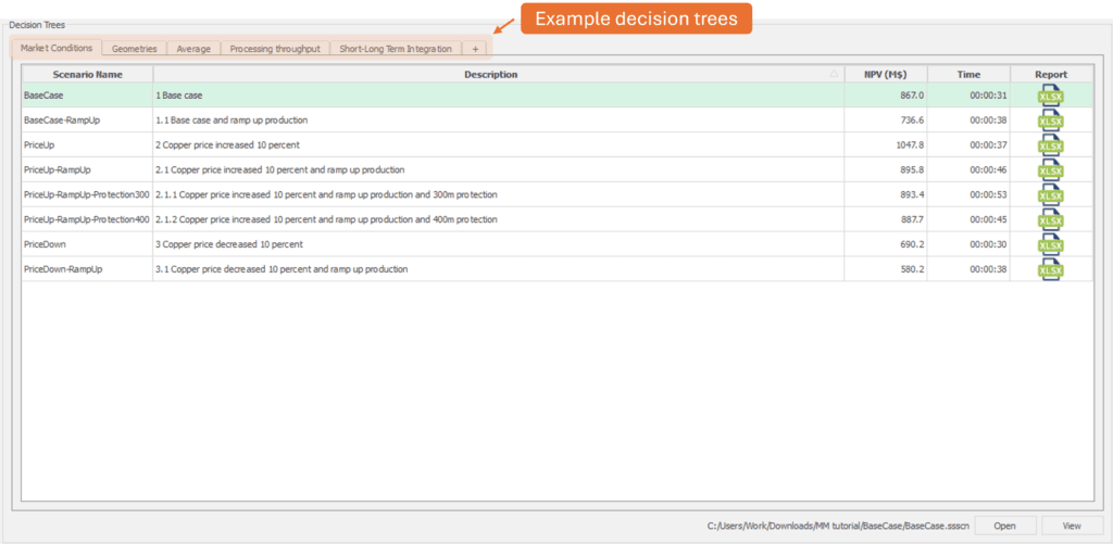 By running multiple scenarios within the same Decision Tree, you can also assess how each change affects the generated mining sequence, as in the example below.