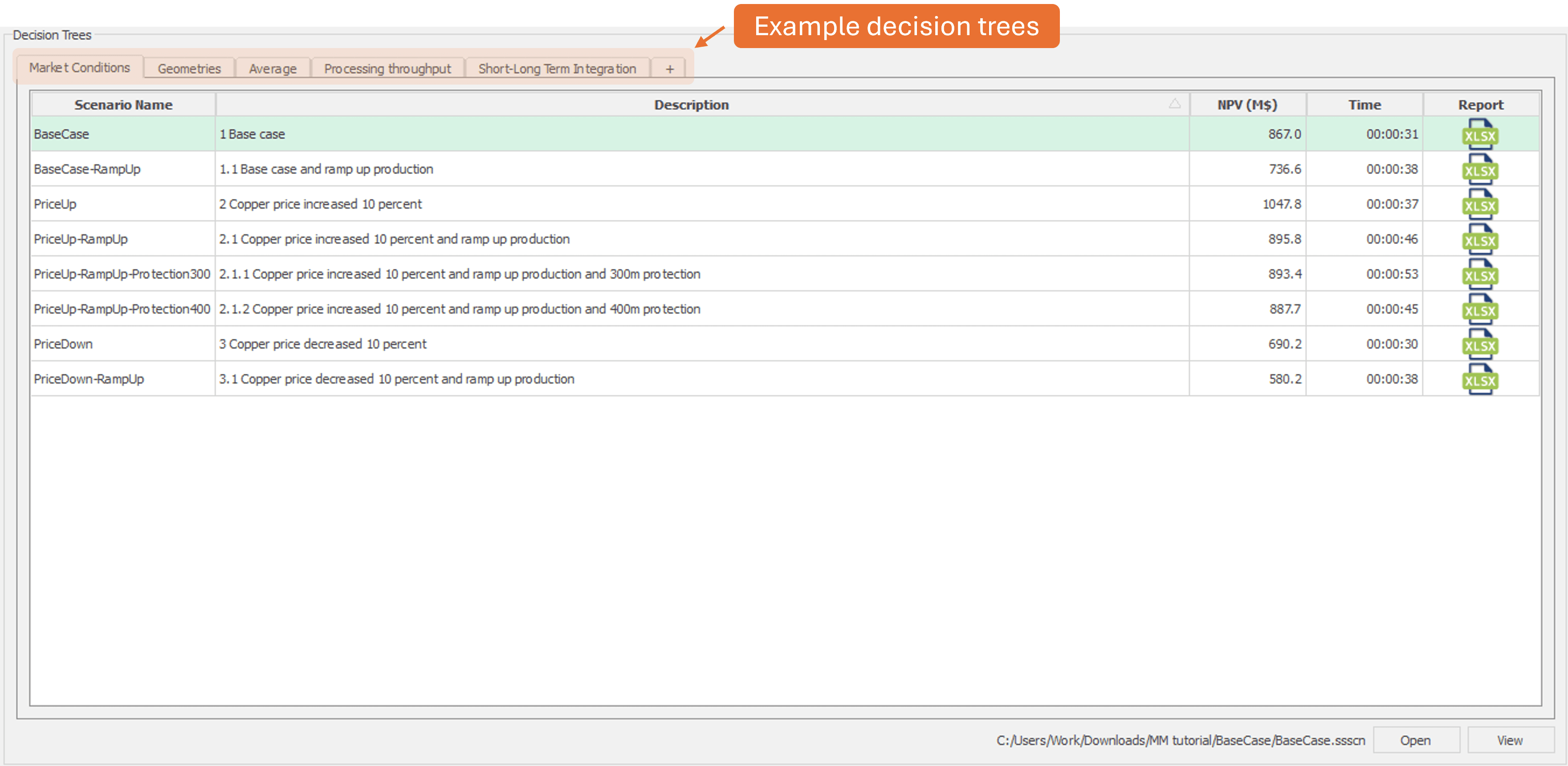 Árboles de decisión Le brindaremos una visión integral de su proyecto, Ayudándole a planificar su secuencia de minería evaluando cada escenario posible. Permiten evaluar las restricciones, Identificar las opciones más viables y rentables para el proyecto en general, y comprender el impacto de diferentes variables en el VPN final. Por ejemplo, Considere la producción de plantas por año como un factor variable. Con árboles de decisión, Puede analizar cómo cada restricción (como el precio del mineral) afecta la producción anual e influye en el éxito general del proyecto..