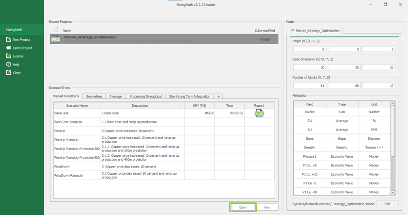 Al utilizar la versión gratuita de MiningMath, El acceso a todas las funcionalidades del software está restringido a la base de datos de Marvin., que viene preinstalado. Esta base de datos se identifica por sus pendientes específicas., dimensiones del bloque, y dimensiones del modelo. En el caso de que estos valores hayan sido modificados por cualquier motivo, el archivo original se puede descargar aquí.