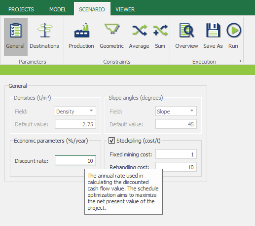 la tasa de descuento (%/año) es proporcionado por el usuario en la interfaz de MiningMath, como se muestra en la siguiente figura.