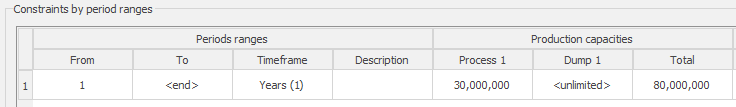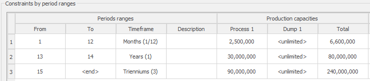 MiningMath permite la creación de escenarios en los que se definen rangos de periodos con marcos de tiempo personalizados (meses, trienios, décadas, etc), como se muestra en la figura 3.
