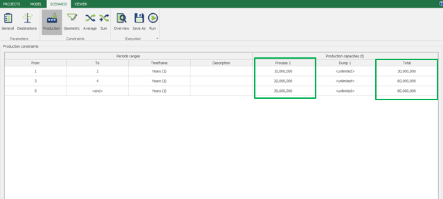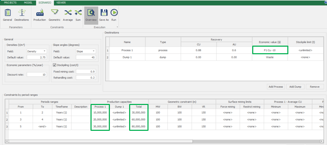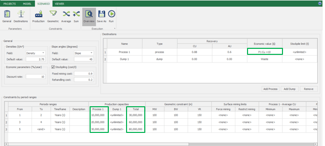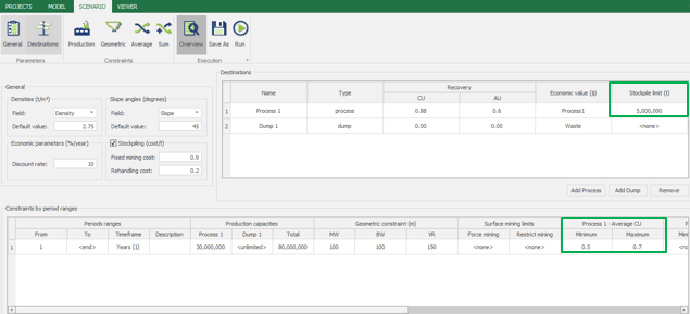 Aquí, lo mismo restricciones de mezcla del escenario anterior (AvgCu) fueron agregados, además de un límite de reservas de 5Mton por proceso 1, en la pestaña de destino. Esta característica le permite controlar el límite de stock de todo su proceso, lo que aumenta la flexibilidad de optimización para alimentar la planta, respetando las restricciones de combinación que ya se implementaron.