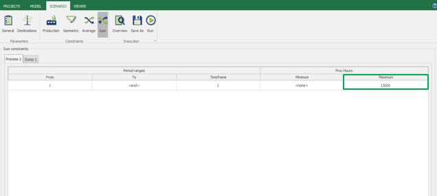 Escenario Proc13000h considera 13.000 horas de equipo de procesamiento utilizado como el límite máximo. Esta restricción se insertó en la pestaña de suma y controla variables como la alimentación del tipo de roca, consumo de energía, y cualquier parámetro controlado por su suma. Escenario Proc13000h-33Mt considera un aumento de 10% en la producción, insertado en la pestaña de producción más allá de los parámetros mencionados anteriormente.