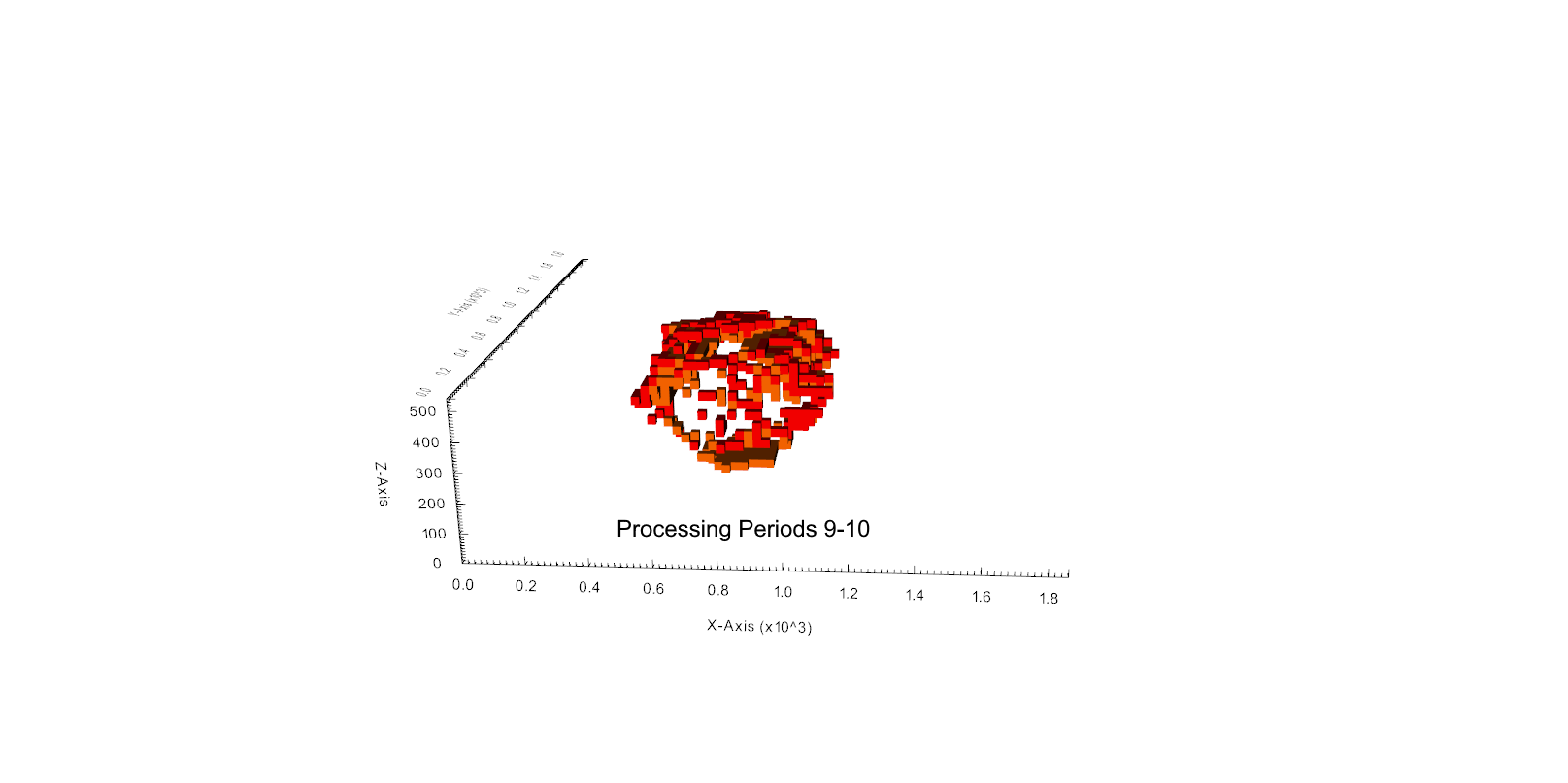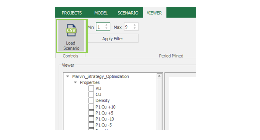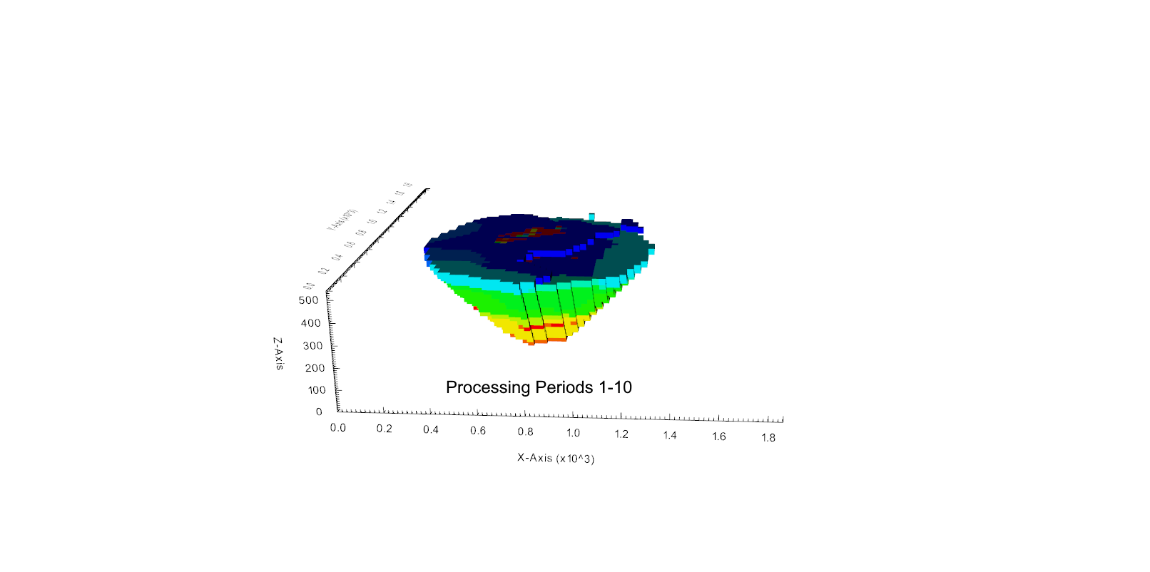 El visor 3D permite una vista de su modelo desde diferentes ángulos. Los colores de los bloques se definen de acuerdo con cada propiedad mostrada, variando de azul a rojo (de menor a mayor), debido a los destinos, periodos, o cualquier otro parámetro. Por lo tanto, es posible filtrar los bloques por el período en que fueron extraídos o procesados, por ejemplo. Además, también te permite comparar múltiples escenarios cargando diferentes casos y usando la barra izquierda para cambiar de uno a otro.