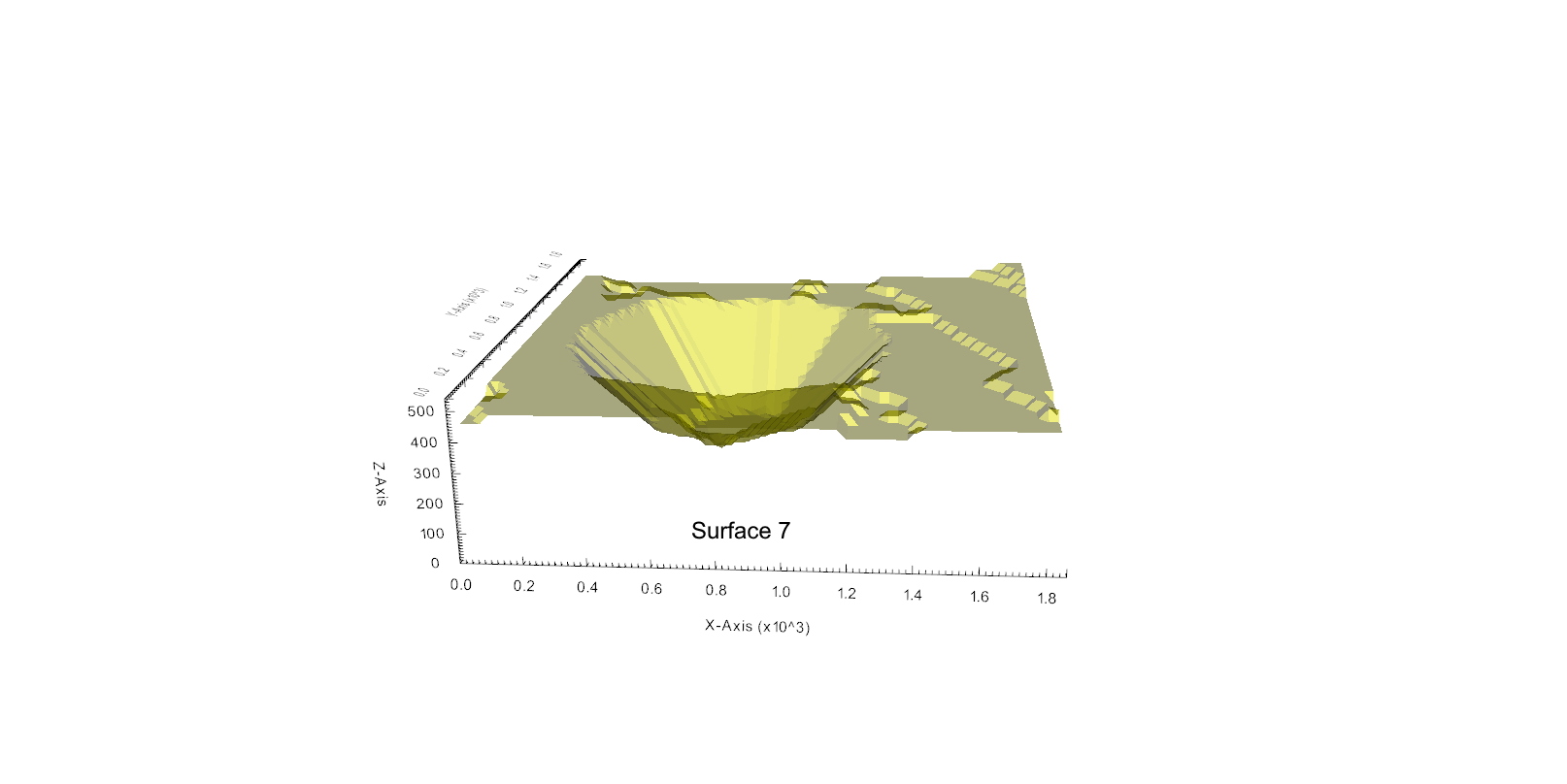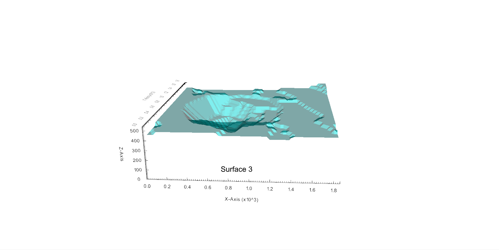 El escenario de la superficie trae una cuadrícula de puntos generada a través del pozo de cada período: cada superficie se nombra de acuerdo a sus períodos de minería y contiene información sobre las coordenadas topográficas en ese momento. Estos archivos se pueden importar al visor por separado, para que puedas verificar y validar tus datos antes de iniciar el proceso de optimización. Nota: Las superficies se exportan/importan desde/en MiningMath en Coordenadas.