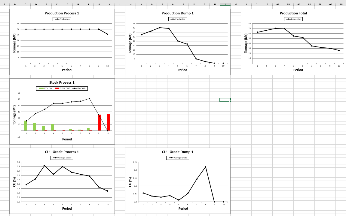 le proporciona un breve informe con los principales resultados de la optimización: varios gráficos y hojas en las que se puede analizar la producción en cada período, las existencias por periodos, la nota media de procesos y volcado, VAN por periodo, el VAN acumulado (Valor presente neto), etc..