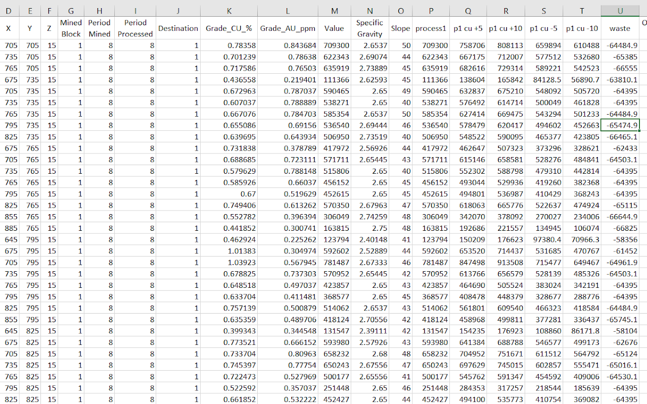 Este archivo ofrece una informe detallado sobre todos los bloques minados y sus especificidades: información sobre la secuencia de minado en base a cada bloque extraído, junto con períodos extraídos y procesados, destinos, valor económico, y toda la información utilizada para la optimización. Este archivo también le permite identificar los bloques que se almacenaron y el proceso de toma de decisiones del algoritmo..