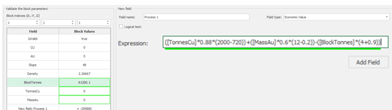 • Proceso de valor económico = ([TonnesCu]* 0.88 * (2000–720)) + ([MassAu] * 0.60 * (12 – 0.2)) – ([BlockTonnes] * (4.00 + 0.90))