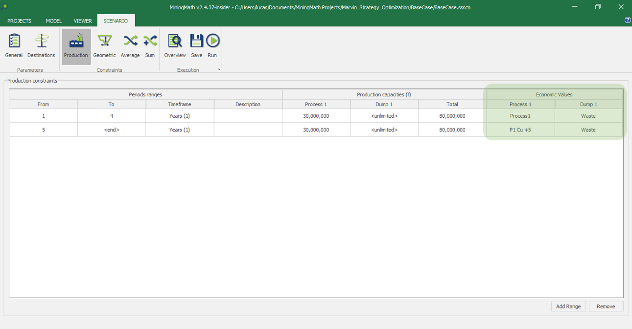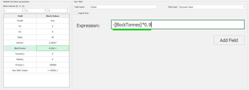 Cada campo relacionado con Valor económico (Proceso/Residuos) debe informar el valor de cada bloque en función de su destino (Proceso o Residuos en este ejemplo), Los grados, recuperación, costo de minería, costos de acarreo, costos de tratamiento, costos de voladura, precio de venta, etc.. El usuario no está obligado a preestablecer el destino, ya que el software determinará la mejor opción durante la optimización.