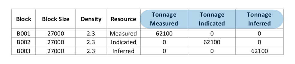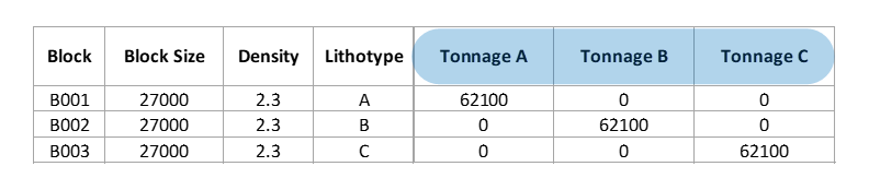 Para controlar la cantidad de material por tipo de roca, crear columnas para tonelajes de cada litotipo, como se muestra en Figura 1, donde: