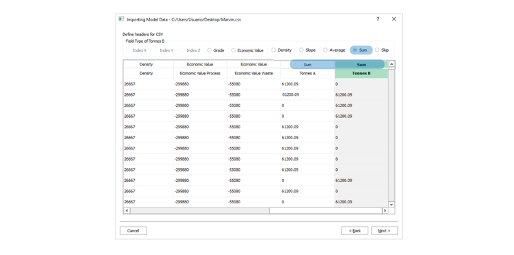 Cualquiera que sea la variable que se modela, las columnas creadas con un propósito similar deben asignarse a la Tipo de campo “Suma”, durante la importación, como se muestra en Figura 3.