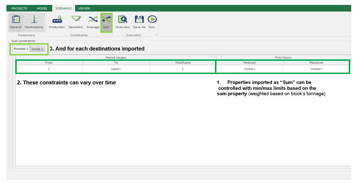 en la interfaz, el usuario tendrá que insertar General y Destinos parámetros para habilitar el Suma pestaña (Figura 4). El siguiente paso es definir los límites que se impondrán a cada variable, a que destinos, y a qué intervalos de período.