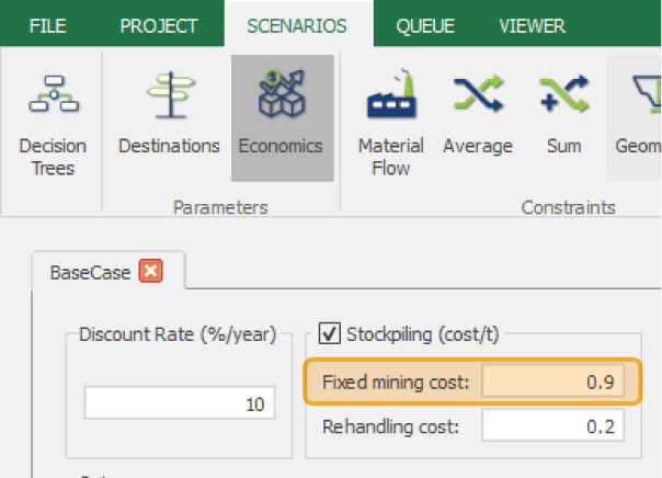 The software uses a fixed mining cost, which is incorporated into the economic formulation at an early stage. This value is entered through the user interface, enabling the software to recognize and adjust the pre-calculated economic values accordingly. The appropriate discounts are then applied to each block based on its status: whether it is (1) processed, (2) discarded, or (3) stockpiled and later processed. In all cases, mining costs are factored in before processing costs and revenue are considered.