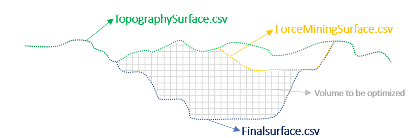 Usándolos juntos, el usuario puede alcance la forma exacta de un pozo si ingresa la misma superficie que Forzar y Restringir la minería al mismo tiempo (Figura 1), que tiene la máxima prioridad restricción en el orden de la jerarquía. También es posible optimice el material entre superficies si agrega diferentes superficies en estos dos campos (Figura 2), que podría ajustarse para corregir el ángulo de pendiente general o para aumentar el VAN, Como se mencionó antes.
