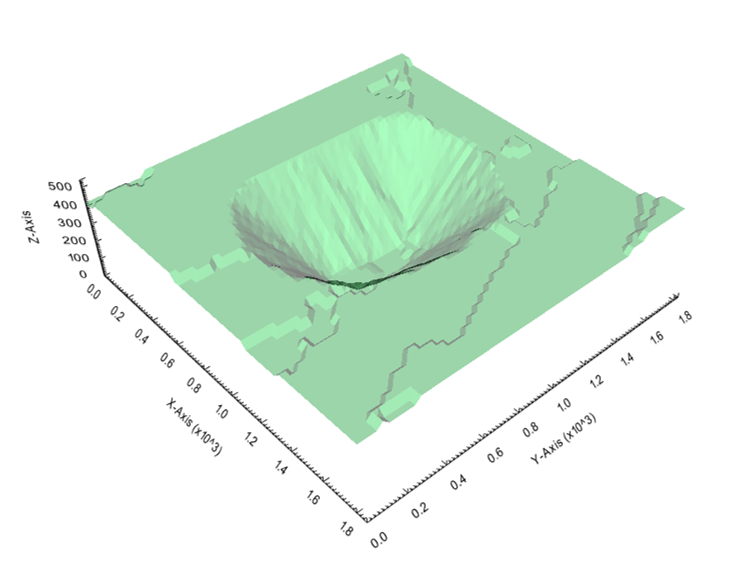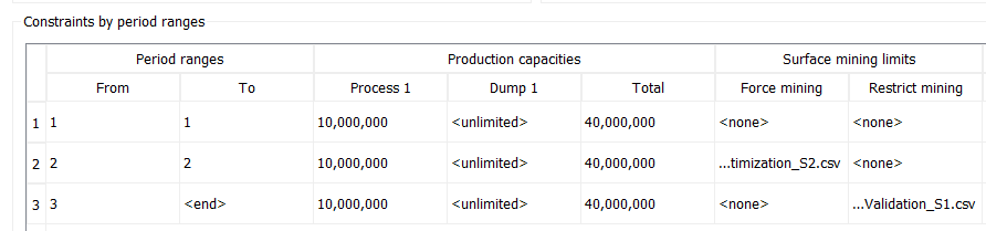 En este ejemplo, se utilizó las mismas restricciones que se mencionaron en el optimización de horarios página. Además, la superficie 2 de este escenario era añadir la minería de fuerza campo en el segundo marco de tiempo, lo que significa que por el final del segundo período la minería debe alcanzar al menos la forma impuesta. Él superficie restringida usado procedía de la validación de restricciones página y fue añadido en el último intervalo, Lo que significa que el algoritmo no pudo superar este límite. Figura 3 revela el volumen optimizado de la secuencia de minería entre las superficies insertadas, y figura 4 muestra la configuración del escenario.