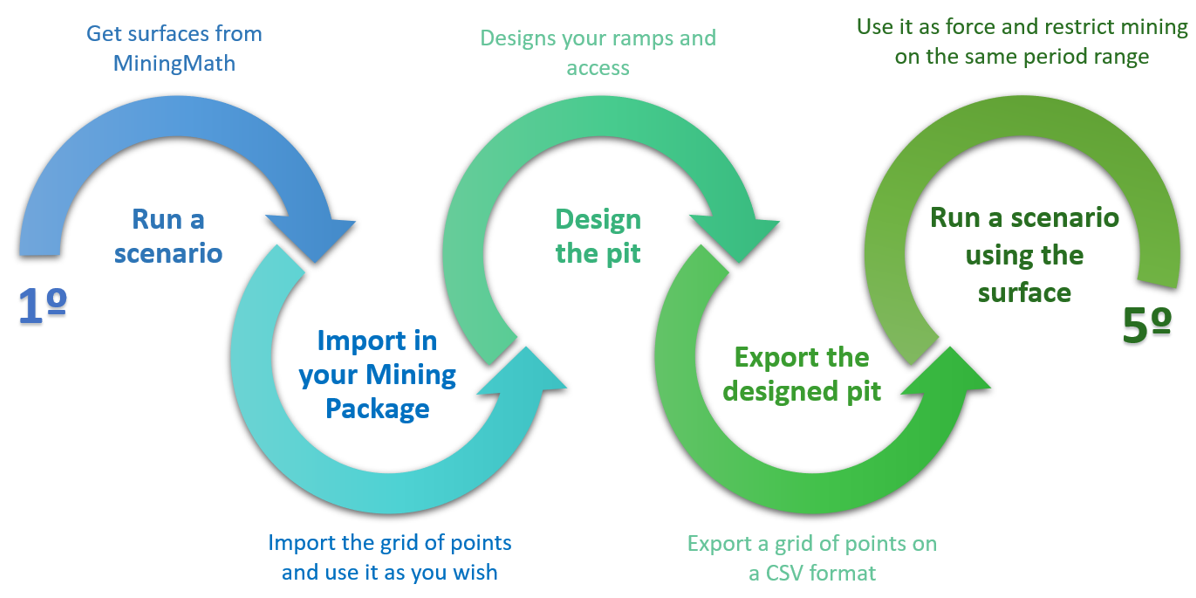 En base a estos conceptos, MiningMath le permite exportar superficies del mejor escenario a un paquete de minería más grande, diséñelo con su paquete de minería, crear la grilla de puntos, importar el foso diseñado, y, por fin, optimizar y refinar tanto como puedas usando restricciones inteligentes. Por lo tanto, el usuario tiene la ventaja de controlar los resultados guiándolos de acuerdo con los requisitos del proyecto.