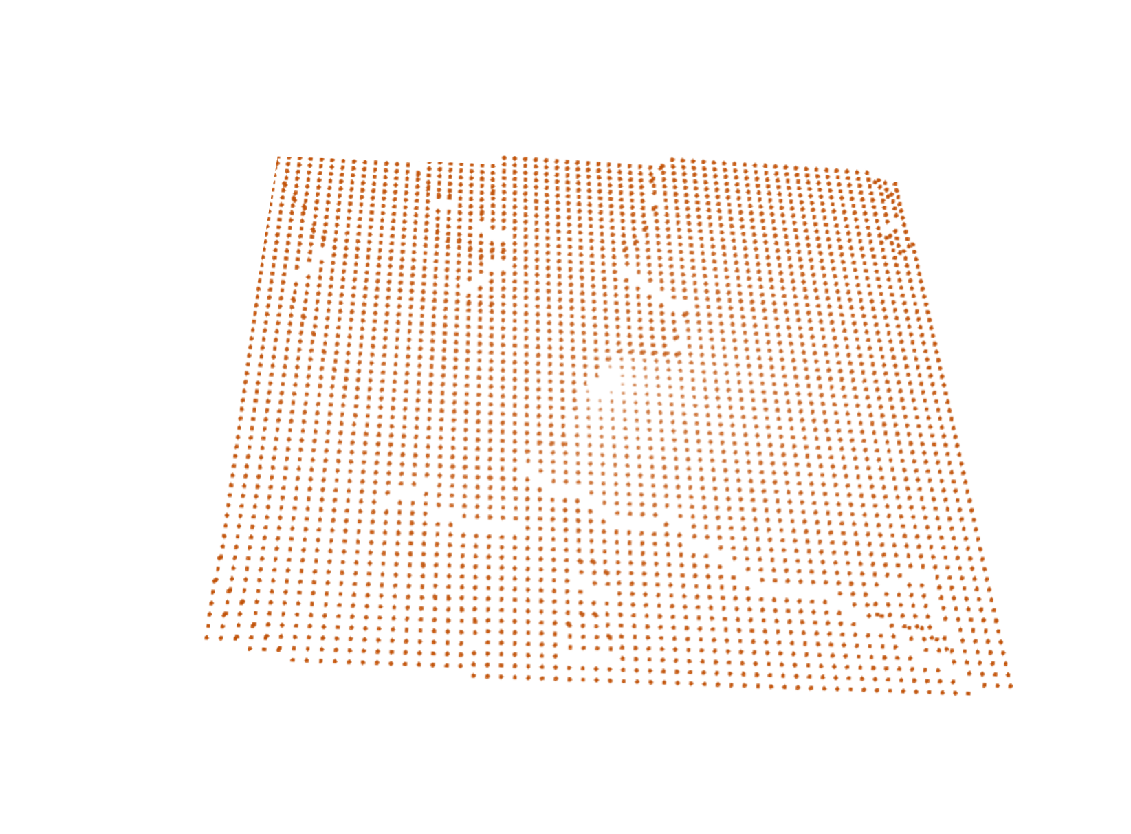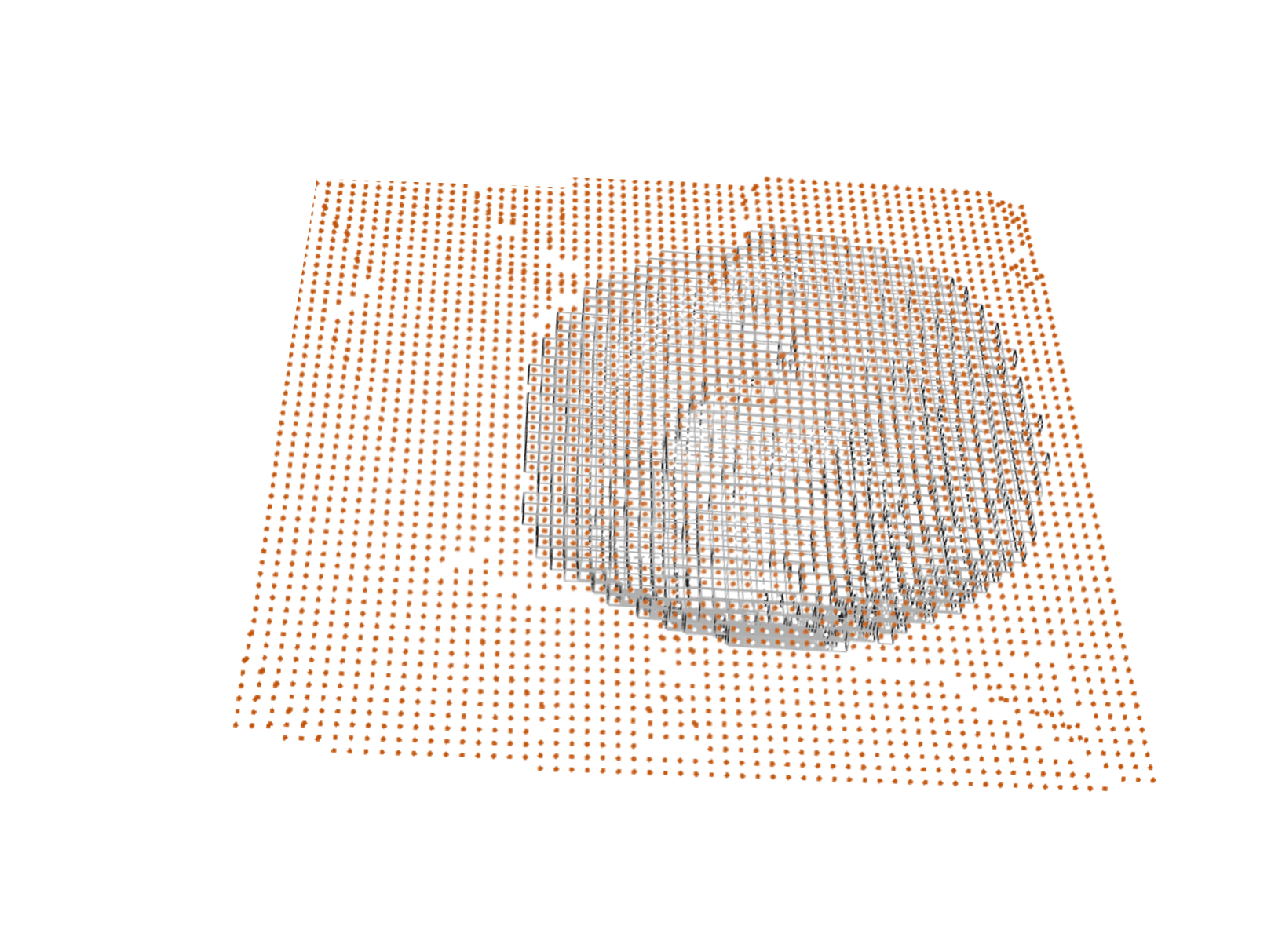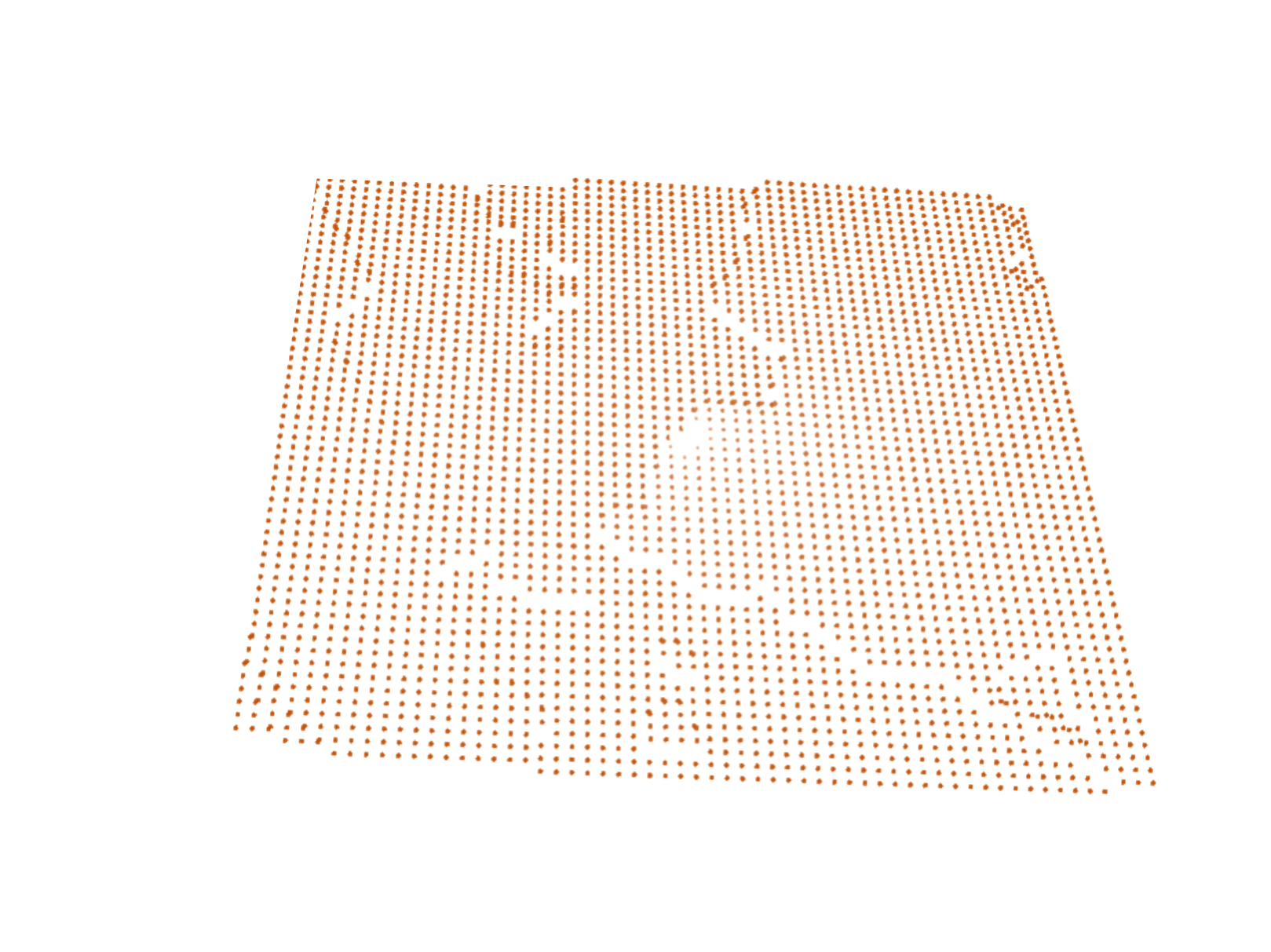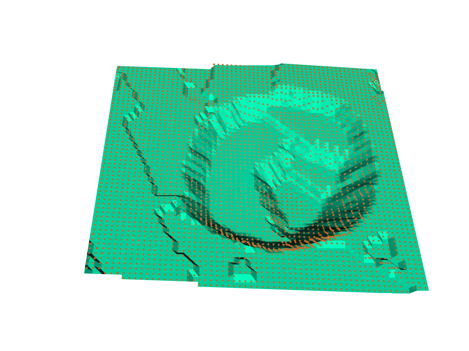 Los archivos de superficie en MiningMath son un conjunto de puntos (Figura 1), cual están alineados con los centroides de los bloques en los ejes X e Y (Figura 2). La forma más fácil de evitar cualquier mensaje de error es mediante el uso de una superficie topográfica creada por MiningMath sobre el Validación de datos, por ejemplo, y entonces manipulando solo las coordenadas Z.