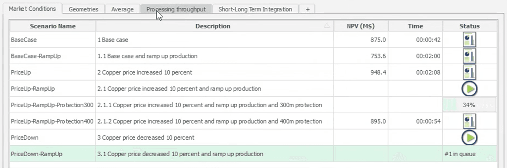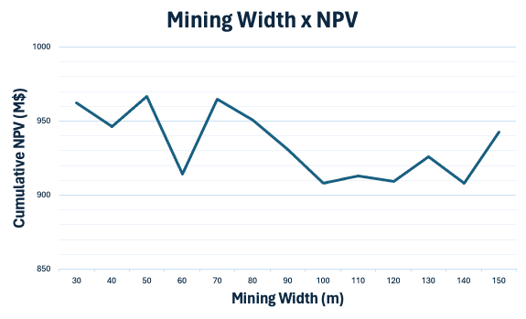 For instance, changing the minimum mining width from 30m to 80m in 10-meter increments may reveal a nonlinear response curve. Instead of an expected smooth fall in NPV, results fluctuate, highlighting patterns that only become visible through dozens of executions.