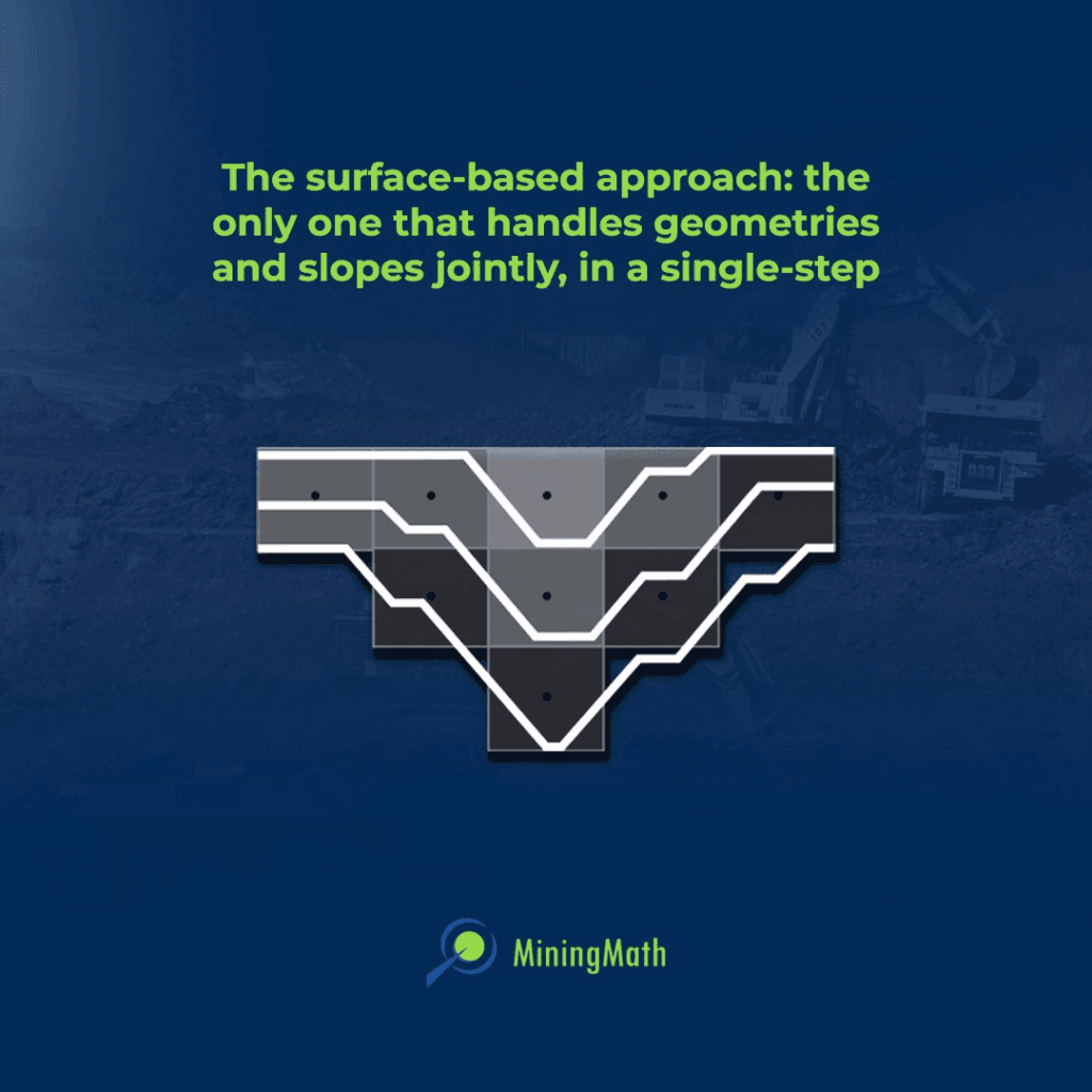 Unlike MiningMath, technologies based on the Lerchs-Grossmann and Pseudoflow approaches often exhibit a well-known “slope error”, which represents the discrepancy between the input parameters for the OSA and the actual measurements derived from the output pit shells. This issue arises from the “block precedence” methodology, where calculations connect the block’s centroids, a process that may not align with the block model dimensions. As a result, the decision to mine a block in its entirety or not can impact the OSA, potentially complicating the generation of a pit shell that matches the designed pit.