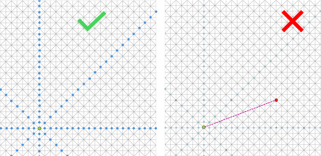 Estructura de cuadrícula. Izquierda: Un ejemplo de un solo punto (verde) con una restricción de pendiente asociada, mostrando todos los puntos adyacentes (azul) que cumplan con las limitaciones definidas. Bien: Un ejemplo de dos puntos arbitrarios (verde y rojo) que no estén sujetos a ninguna restricción entre ellos.