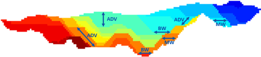 La tasa de avance vertical (o tasa de siking) se define como la distancia vertical, en metros, minado en cada periodo, y se calcula evaluando cada frente minero de forma independiente, como se muestra en esta figura.