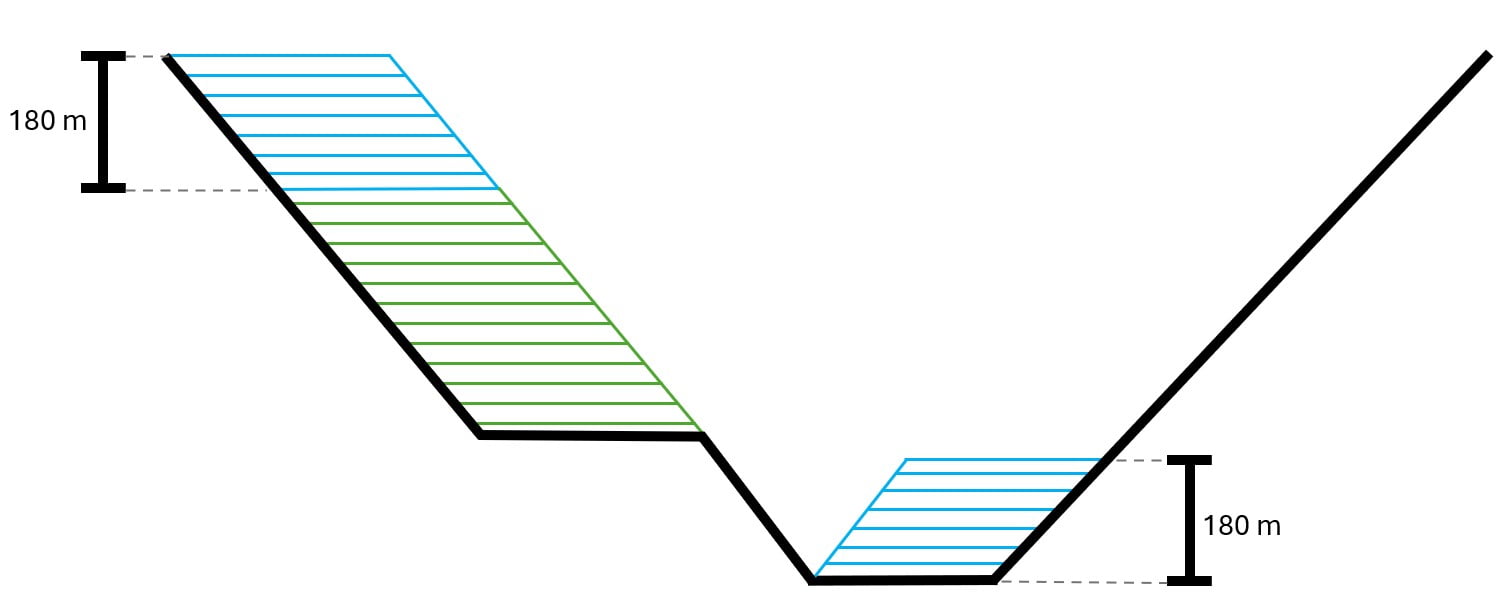 Dos frentes mineros en relación al mismo período (azul) y sus distancias verticales minadas en metros.