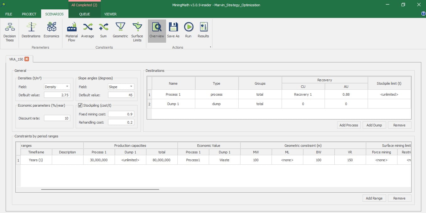 Además, si el usuario pretende forzar una tarifa vertical máxima para un período determinado, Se puede crear una restricción de superficie plana con respecto a la profundidad alcanzable e ingresarla como una Restringir Minería. Más allá de eso, es importante señalar que incluso el objetivo de lograr un "proceso completo" podría resultar en una solución no factible mientras se siga respetando la realidad virtual., por lo tanto, esta característica es muy sensible a cualquier otro parámetro.