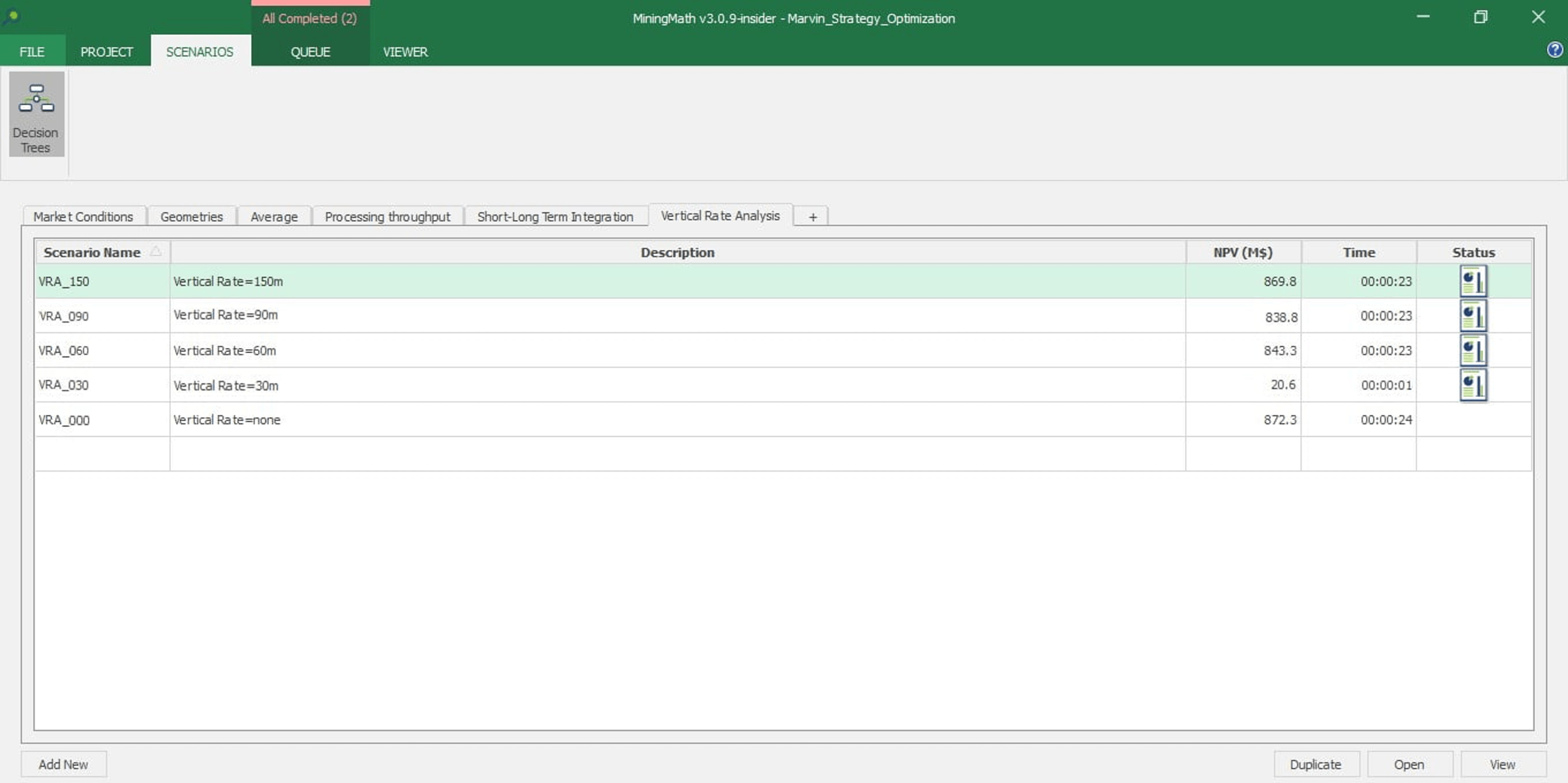 La tasa de avance vertical (realidad virtual) es un parámetro complejo dentro de la optimización. La realidad virtual funciona como límite superior para evitar soluciones operativamente inviables.. Por lo tanto, Probar diferentes valores es una gran estrategia para identificar oportunidades que podrían generar la mejor secuencia minera y VPN..