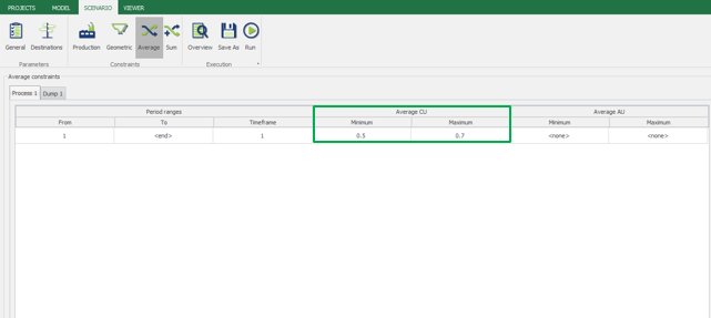 En el escenario AvgCu, restricciones de mezcla se agregaron en la pestaña de promedios para considerar permitidos en la planta de proceso 0.5% como mínimo y 0.7% como ley media máxima de cobre. La optimización deberá cumplir con la capacidad del proceso P1 y, como un reto adicional, tiene que cumplir con este nuevo conjunto de parámetros relacionados con el contenido promedio de Cu dentro del mineral.