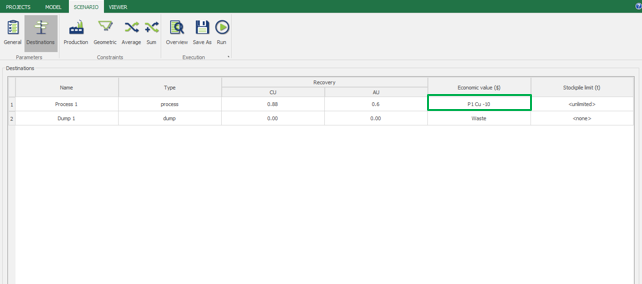 Escenarios “Precio alto” y “Precio bajo” difieren en relación con el escenario básico en el valor económico utilizado para el cálculo del proceso P1, donde hay un aumento y una disminución de 10% al precio de venta del cobre, respectivamente. En la pestaña de destino, “P1 Cu +10” y “P1Cu-10” fueron los valores utilizados para el proceso.