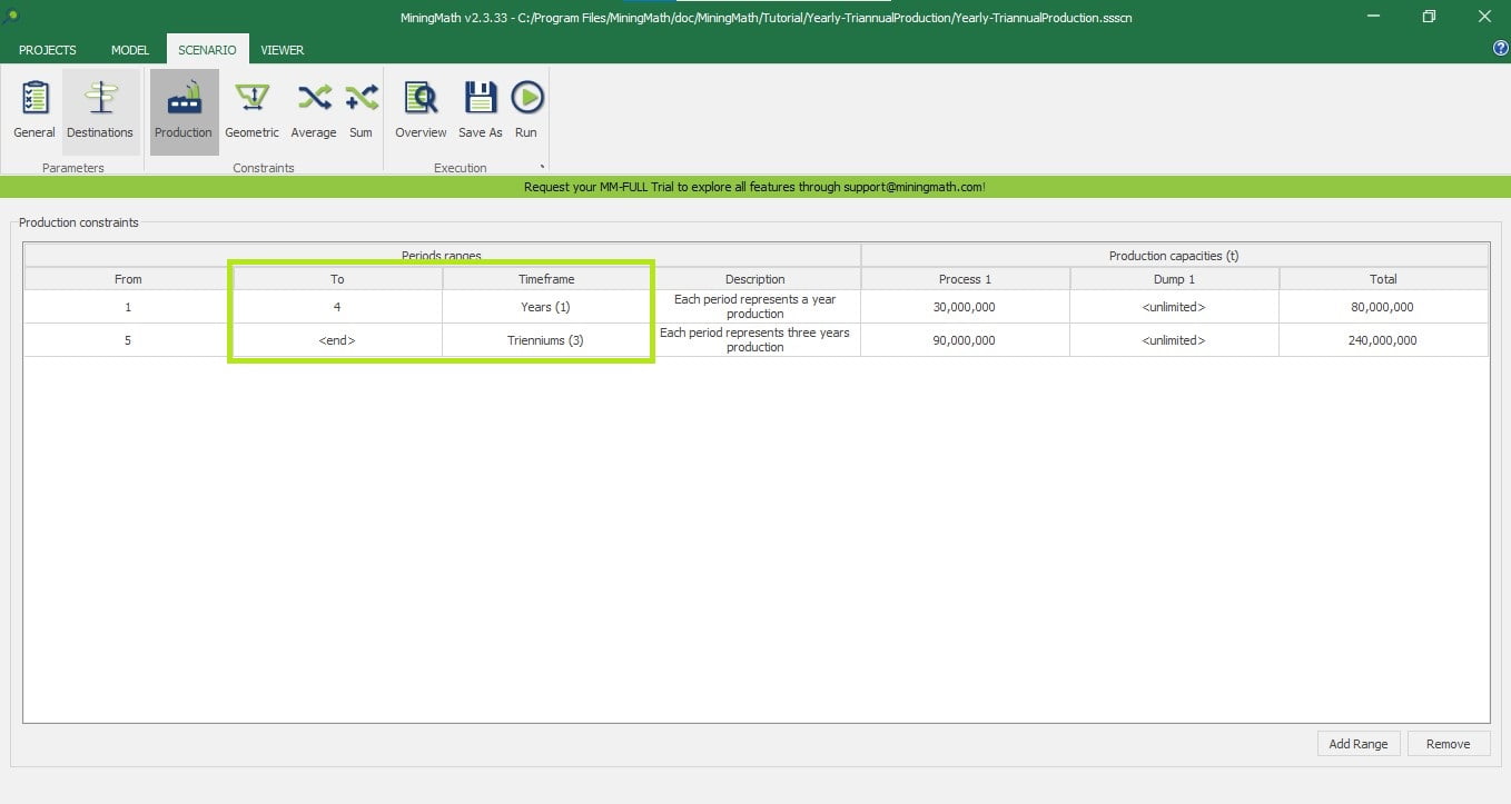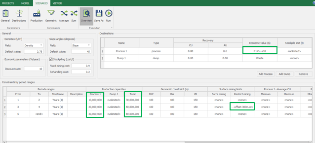 MiningMath le permite aprender con cada escenario al proporcionar parámetros estándar que simulan algunas limitaciones comunes que una empresa minera puede enfrentar. Los escenarios estándar se enumeran y describen a continuación para que pueda identificar los principales cambios realizados dentro del “Visión de conjunto” pestaña.