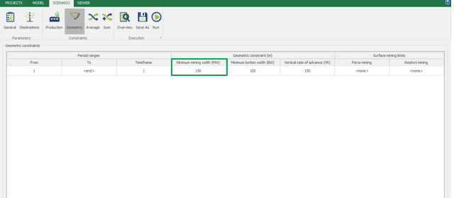 El escenario MW150 considera diferentes geometrías del caso base en las restricciones geométricas. En este escenario, 150 metros fue utilizado como ancho de minado (la distancia horizontal entre las paredes de dos superficies que pertenecieron a periodos consecutivos), y una tasa de avance vertical de 180 metros.