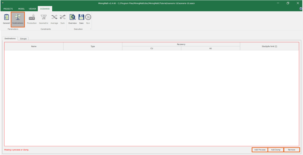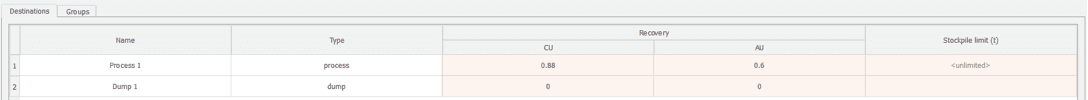 MiningMath requiere al menos un destino para el procesamiento y uno para el volcado. Cada proceso debe tener un campo de recuperación, y también puedes definir límites de existencias para cada destino.