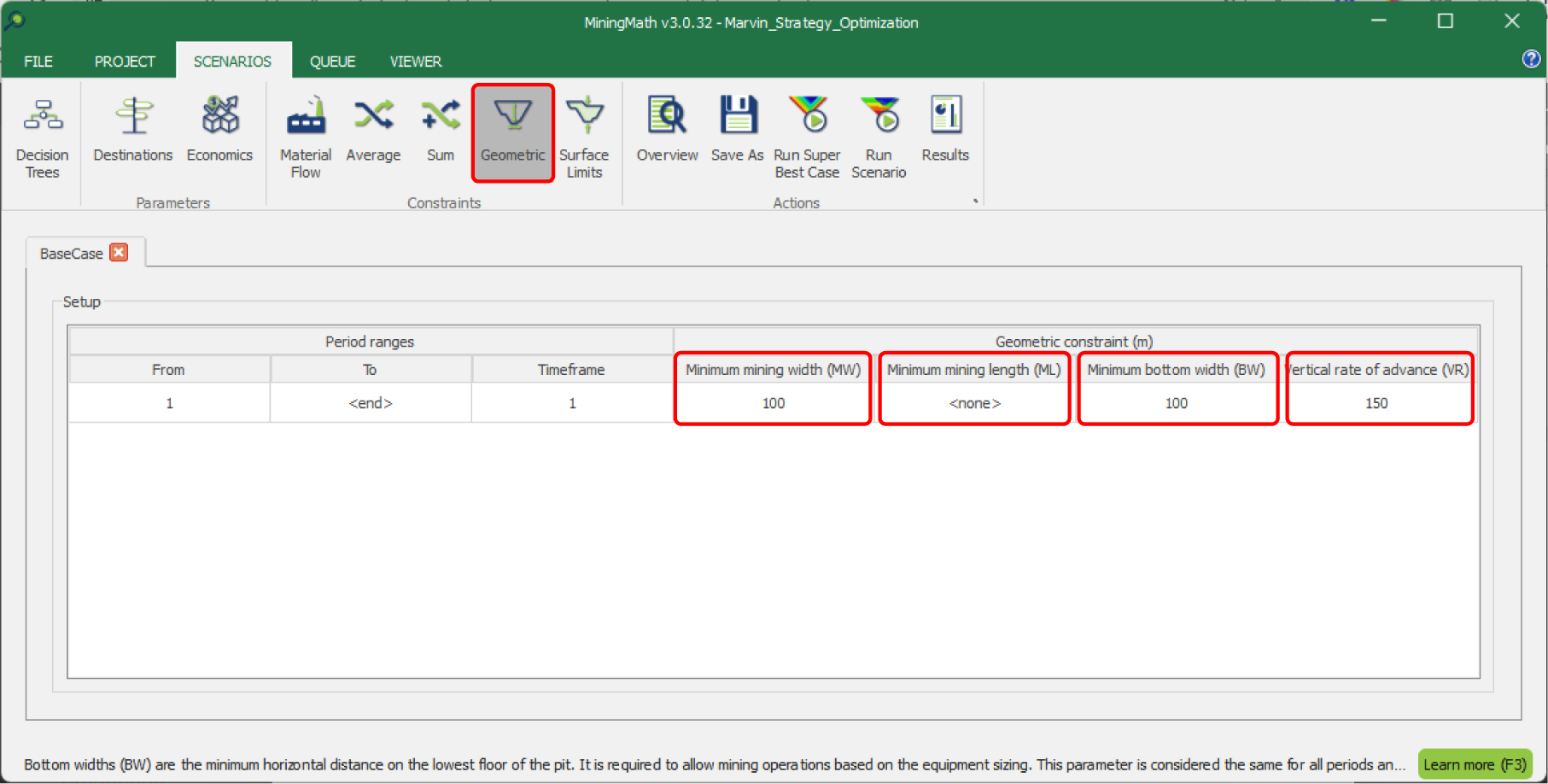 Este parámetro especifica la distancia horizontal mínima (en metros) en el piso más bajo del pozo. Garantiza que las operaciones mineras se puedan realizar de manera efectiva en función del tamaño del equipo. (leer más).