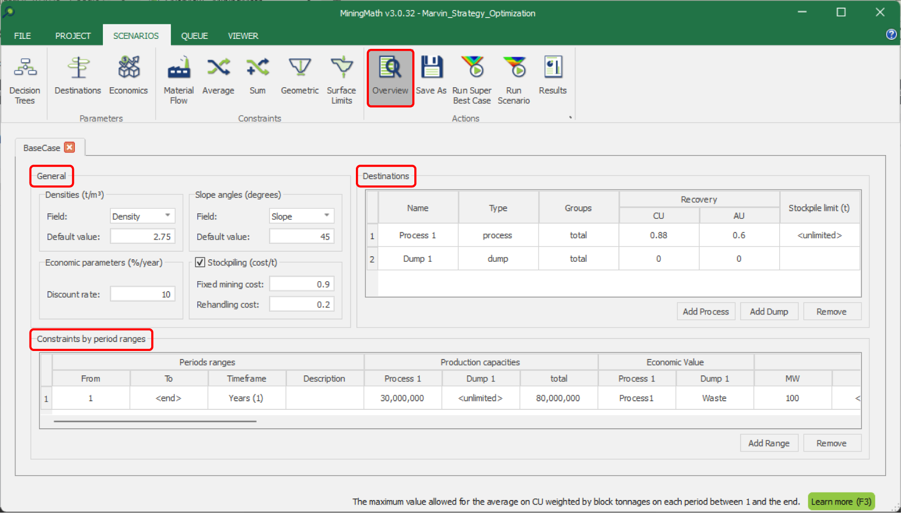 The Overview subtab provides a single page summary of all parameters related to the current scenario.