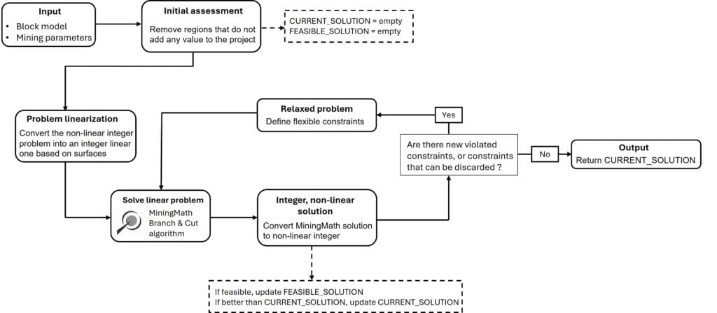The next step in the mining optimization algorithm is to convert the linear solution to an integer, non-linear one. MiningMath’s Branch & Cut method is responsible for this conversion. Once it is done, the resulting solution can be evaluated, leading to the end of the algorithm’s execution or to a new optimization process. This new process might be triggered if one of the two situations arise:
