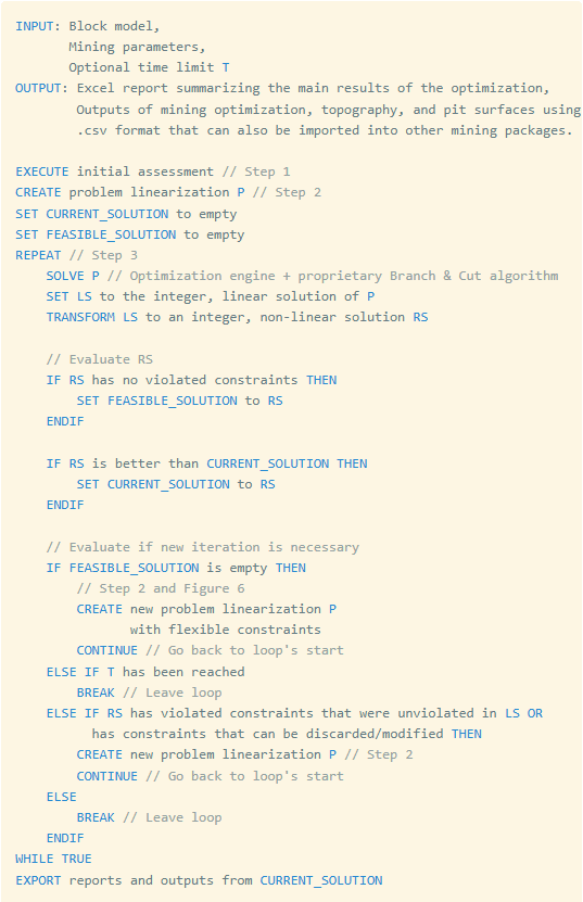 The whole process of the mining optimization algorithm, from input to output is summarized in the diagram and pseudo-code below. References are made to previous Steps 1, 2, and 3. This algorithmic flow together with the proposed mathematical formulation exemplifies the innovative methodology applied to solve a single mine scheduling problem.